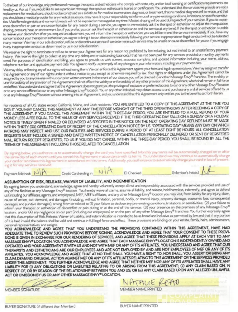 I went to Massage Envy looking for a three massage package, I had been a member before and it didn't work for me. I discussed it with the staff and they got me to complete a form but I paid up front and where it mentioned deduct card details I entered not applicable, as agreed with the front staff.