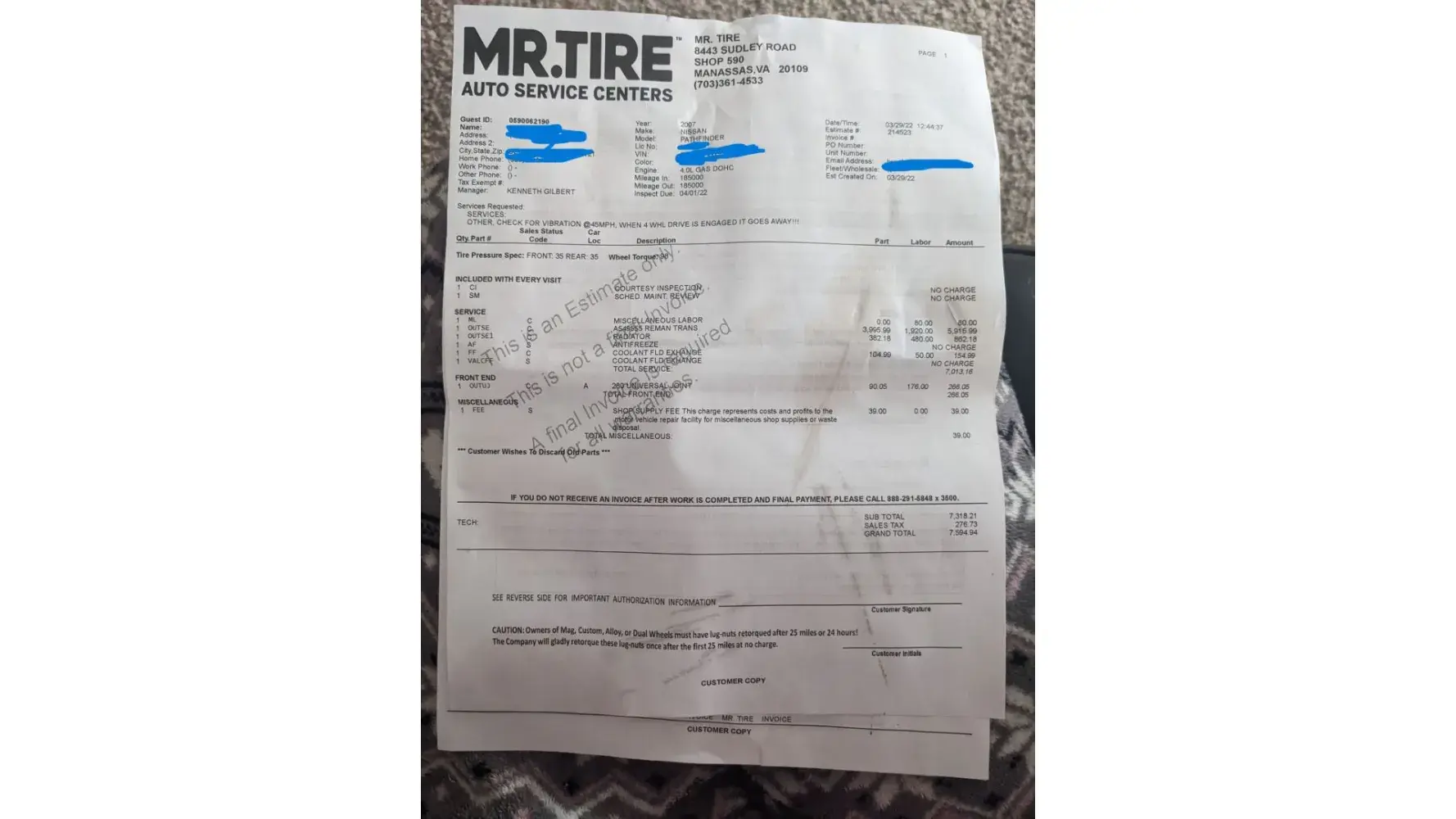 Here is the photo of the estimated bill and repair. My husband just fixed his pathfinder for $28, front and rear ubolts. Mr Tire would have cleaned the transmission and fixed what was wrong, if they identified it, and walked away with $7600 in their pockets. TOTAL CRIMIMALS...and if they claim they are not criminals, then they are incompetent and should NOT be working on vehicles commercially. I forgot that they told him that his radiator had broken and was leaking into the transmission. That was the first clue that they were lying. TOTALLY CORRUPT!