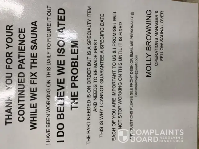 Membership included a working sauna yet the sauna has been "broken" for several months. Management doesn't seem to take the multitude of complaints seriously. A note on the door has been there for several months yet nothing has been done to rectify the issue.