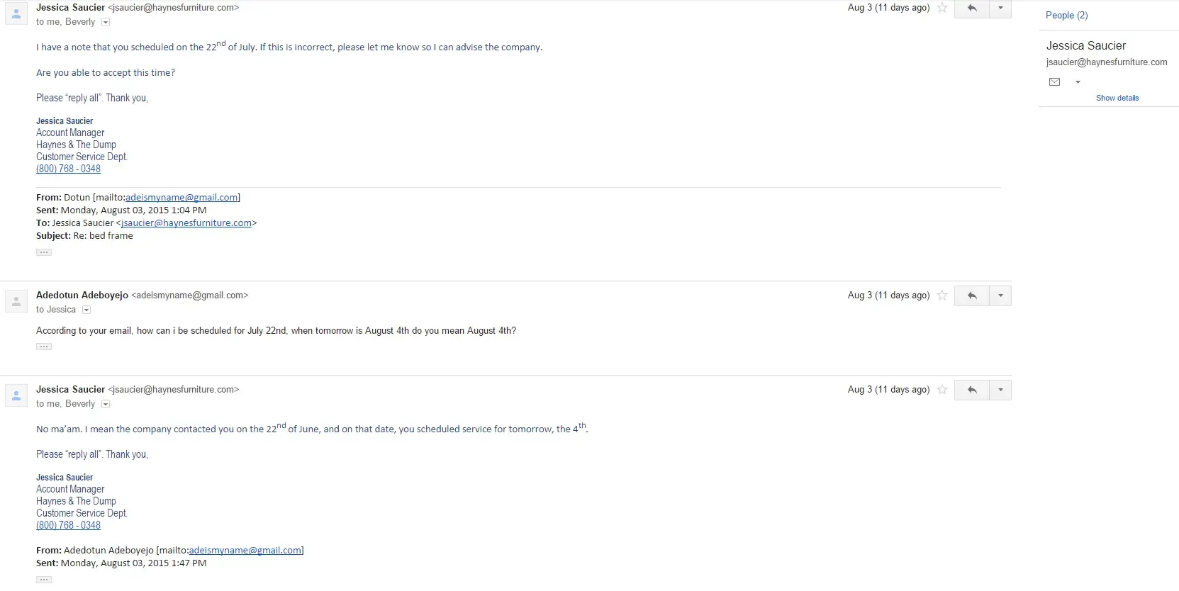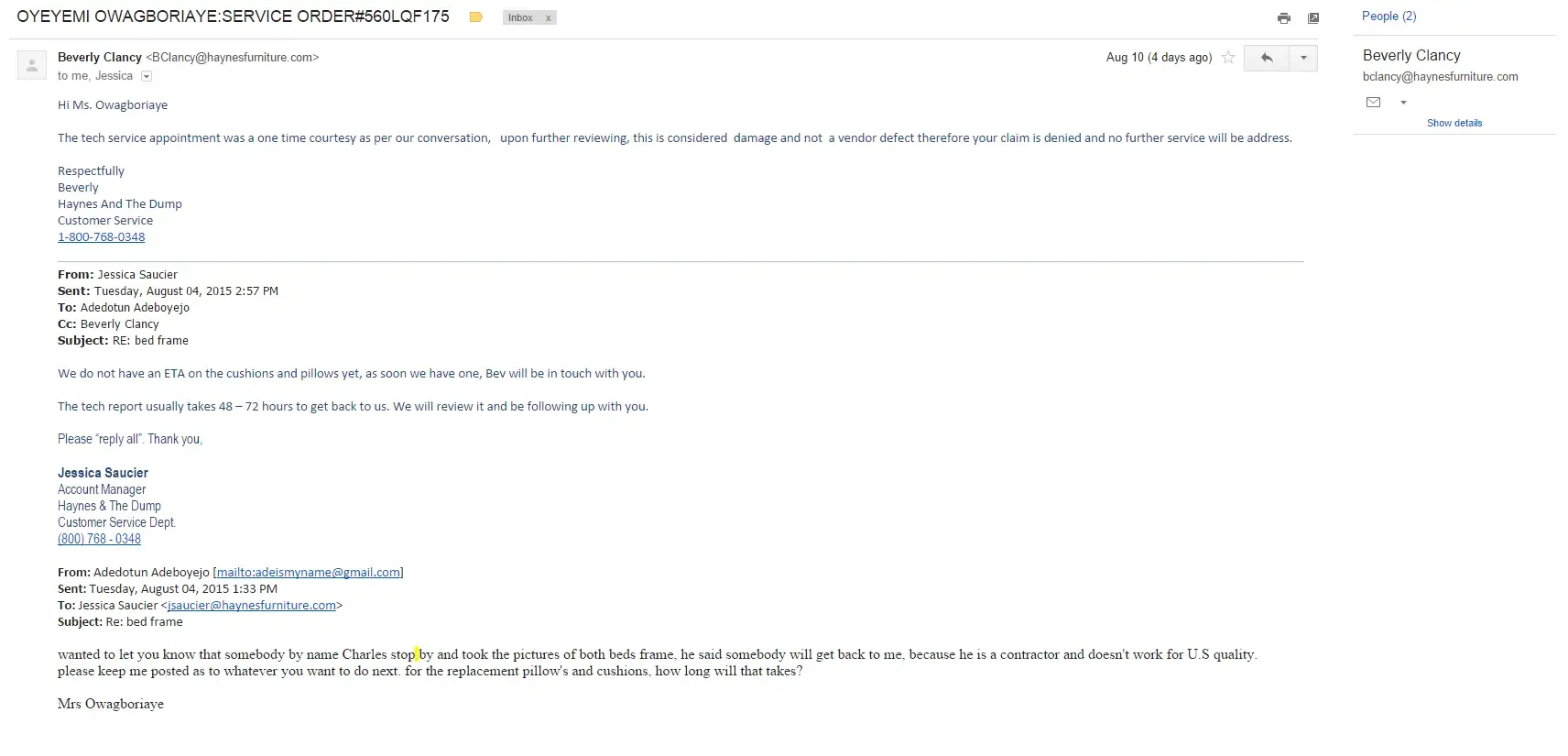 I'm going to forward all my correspondent emails with Ms Clancy and Ms Saucier to whoever is going to review this case, but is it fair to spend $5, 068 on items that lasted for six-seven months? we ran across this site in the process of filing with BBB, and decided to file another one while we proceed with our state/BBB complaints.my weight is 166lbs, my spouse is 132lbs, is it possible to break the foot board of the bed with those weight? What about the other bed with a short two by four? did we cut shrink that too? and how would somebody in their right mind would want to spend money on bed frame twice?