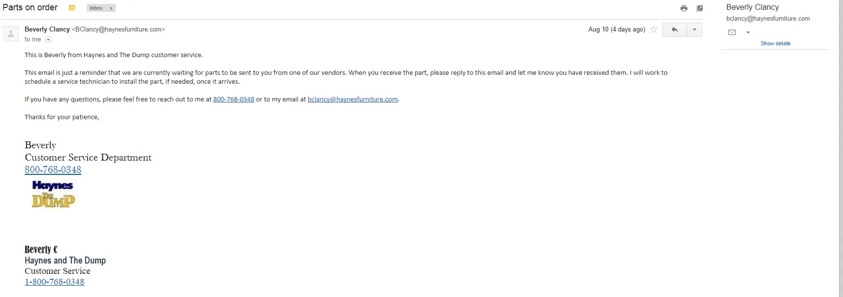 One Saturday during that week, as i was cleaning the girls room, the mattress in their room fell off the frame, without anybody there. When i called on their dad to check it out, we found that the two by four was very short. in june/july, i noticed that the foot bed frame in our room is also separating, i went back to school this summer, and it was a lots of work. i was unable to contact Haynes Furniture. But in the middle of my summer classes, i called and spoke with Ms Beverly Clancy in the customer service, and send her pictures of the cushions, pillows, and the bed, she said she will order new cushions and pillows but the beds is not a defect.
