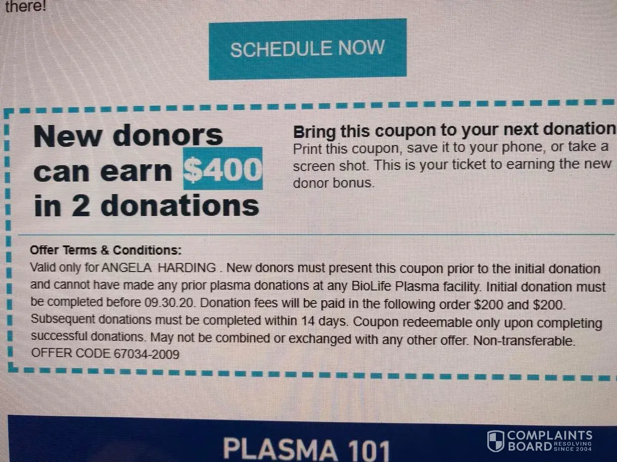 A coupon was applied for $400 on first two donations. I received $200 on the first one on 09/28/2020. I came in for the 2nd appt. on 09/30 and was told my vein needed to heal longer. I scheduled for 10/12 and informed them of my coupon stipulating a 14 day period. I was told by the nurse that the 12th is within the 14 days and would be honored. I had a successful donation on 10/12 and that evening noticed I had only been compensated twenty dollars. I emailed then called the next morning and was told at first that I would be compensated on the second and third donation. When I told her the coupon stated first and second and I had already received the first one, she then said you will be compensated on the 2nd one. I told her that was my second one. She then told me it expired, and I then informed her of what was told to me by the nurse and what is stipulated in the coupon and I was within the time limit. I was then told they have to contact supervisor. No contact made to me as of yet concerning this.