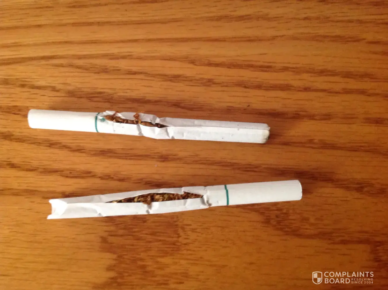 the last 6 packs of cigarettes I purchased had one cigarette broken or sliced open in each pack. I only now decided to make a complaint cause I realized it was not accidentally happening but they are coming in the pack this way, as the first one i took out of this pack was broken. I am not sure if you are aware if this issue but cigarettes are expensive and...