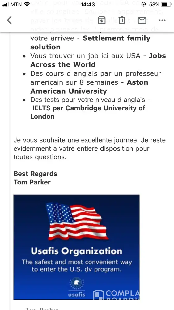 Usafis organization iHas taken more than 7000 k $ since I trusted them to participate and take advantage for the green card lottery, I paid 780 $ to enroll in what they say a vip service that would give you better opportunities to win I trusted them, but later on they call me to ask for more money, they call attorney service through the process and also air tickets, 4000 k $, a year later call me to say that I have finally been selected, win the lottery, and again they took 3000k out of my pocket, they said that in 4 months my green card process would be done … it's been a year and I never knew anything from them, they just email you the same question to fill up over and over, they are scammers, and I am a fool … I'm digging on this cause I will never stop on trying to get my money back, I talked to my lawyer and we are trying to sue them.., if anybody else is in the same situation we should work together, at least to meme them stop robing people