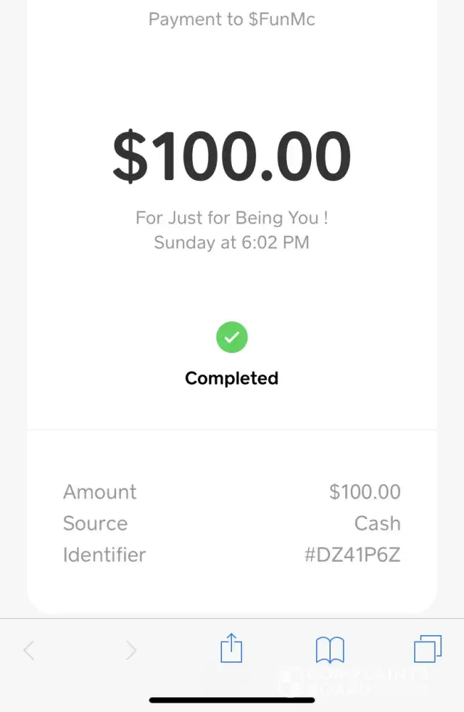 I sent $FunMc a cashapp of 100.00 on Sunday August 26 2019 at 6:02 p.m. my cashapp Id is $Prttyhontas25. They haven't responded back to me through cash support I'm highly pissed. He doesn't have access to the money because that won't verify him I'm pissed ! Cash app is a joke there are no live reps to talk to they only respond by email I'm so pissed I need my money back !