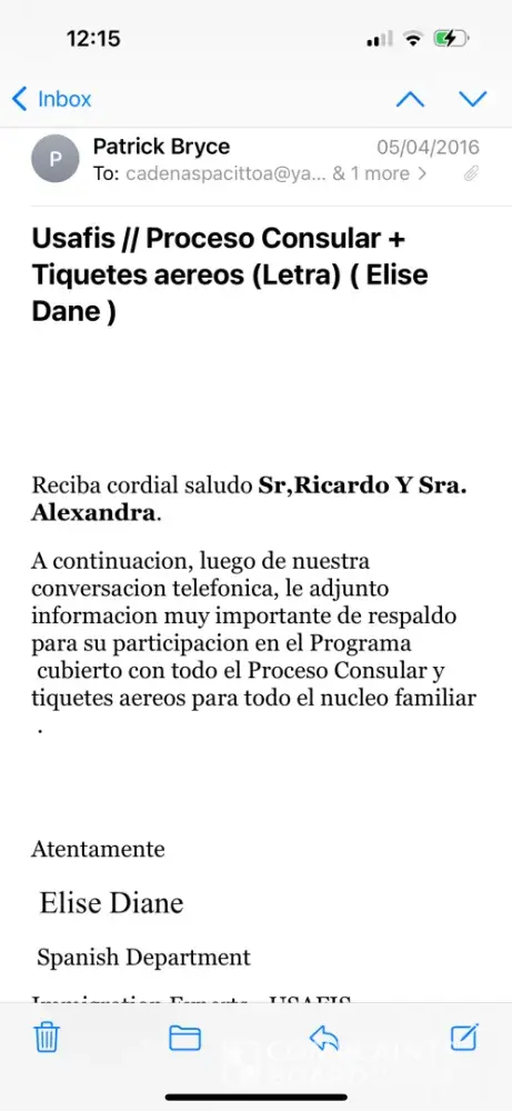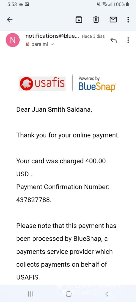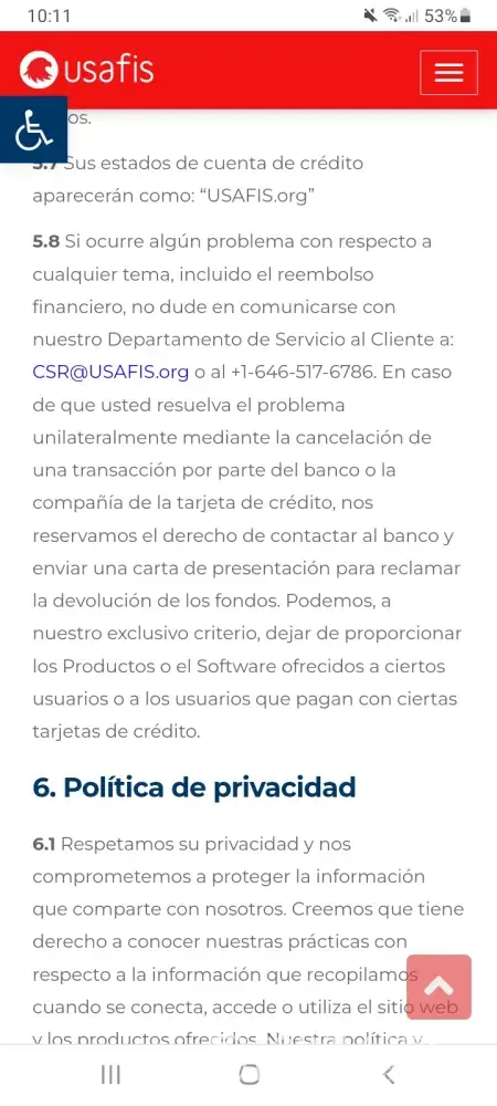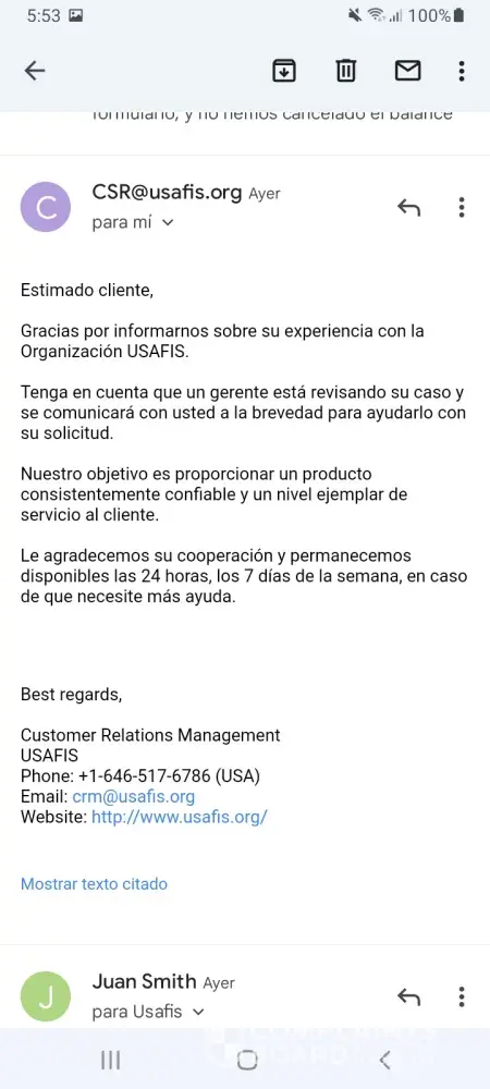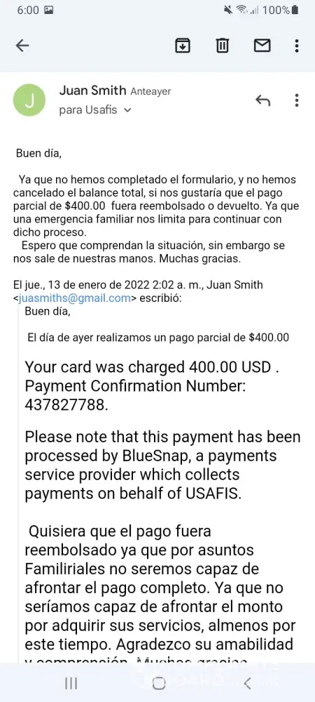 Realice un pago parcial por $400.00 de tarjeta visa de mi esposa, y por temas familiares no podremos seguir conel programa ya que un familiar tiene COVID-19 y esta muy grave. Csr.@usafis.org el 12 de enero 15:04 patrrick.bryce@usafis.org también de este correo. He escrito devuelta y no me contestan. 1-646-517-6786 de este número me llamaron. 1 917-717-5946 de este otro me llamo JAMES SMITH 1-646-680-0945 me llamaron también.