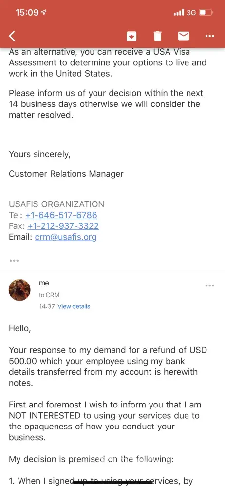 I just want to remind you of the refund of the forcible extraction of 1, 500 dollars from BDO card. At this point I have not filled up and signed any form from you suggesting any VISA services have been initiated between us in my behalf, nor I have sent you any documents which you could claim you have processed; thus, a customer-service provider relationship has not existed between us. Please stop sending me any email anymore indicating I have accepted your services. I was already yelling at one of your staff the last time you tried to enveigle me to move forward with your services. I still keep some respect for USAFIS because I know we all have to earn a living. I hope you should have realised that your way of forcing your services to me has become a harassment.