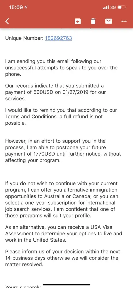 6. I directly wrote an email to Jeff.[protected]@pro-immigration.email asking to refund my money with amount $15 + $ 1157, and after some email discussion, he said the customer services will call me for that. No one calls me after that.