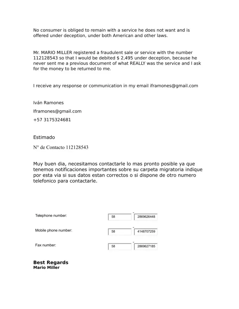 July 29 and 30, 2017 on a charge of $ 2, 495 for a Usafis service through Mario Miller, Senior Manager of USAFIS, under PHONE DECEPTION, as he told me that: "I was receiving a phone call that few immigrants Received for the advance of my processing since 2006, "and it turned out to be a lie or deception and it was necessary for me to pay $ 2, 495 for the legal procedure of my GREEN CARD, travel to the US, legal representation, housing and airfare.