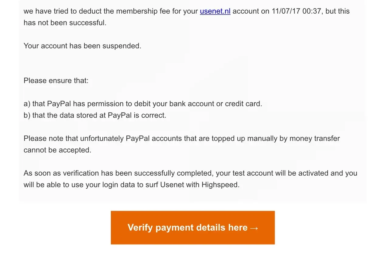 we have tried to deduct the membership fee for your usenet.nl account on 09/05/17 00:42, but this has not been successful.
