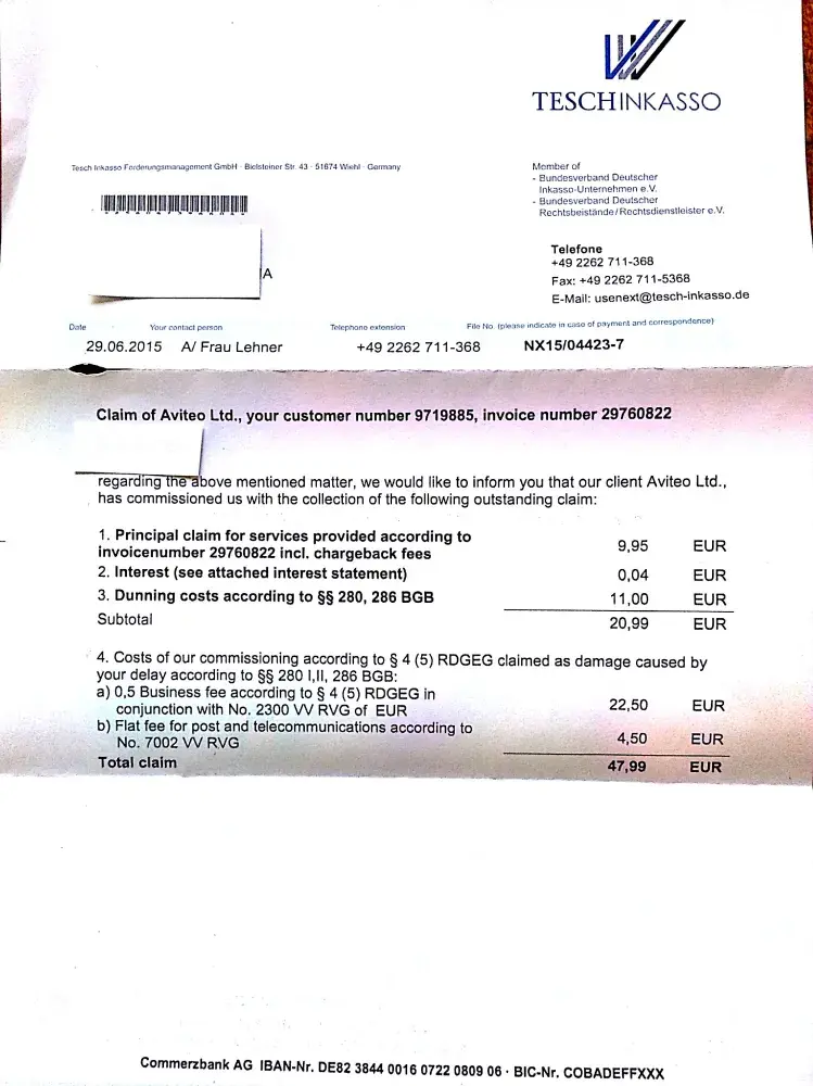 I am also facing the same issue. They started sending me reminders from Nov 2015 and now via the collector TeschInkasso. I had only used their trial services way back during 2015 early start and had then cancelled the paypal agreement. Have never used it after the trial period.