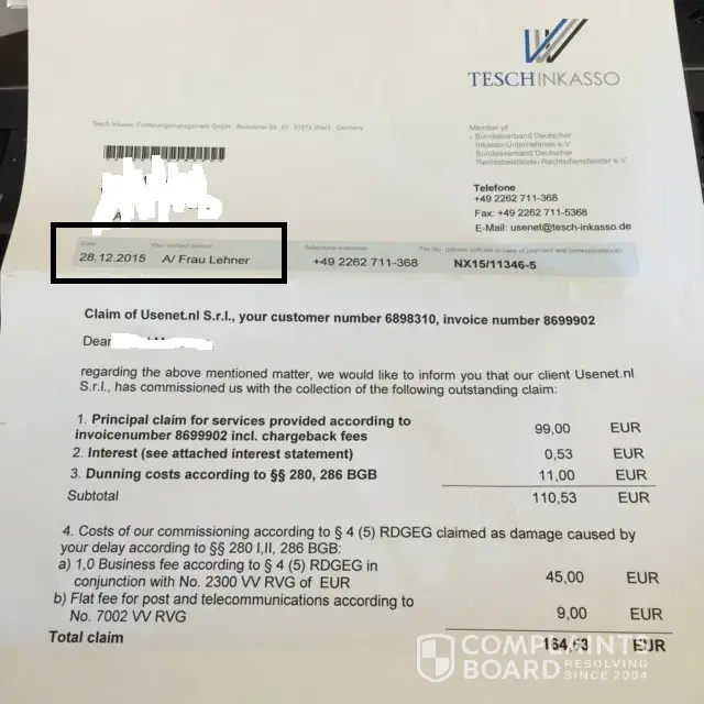 My banking information was stolen and used for this company (as well as many others). I never signed up for their service and started receiving letters from the Tesch Inkasso company stating they were going to take action against me. My stolen card was linked to this account and cancelled at the bank prior to the first billing date listed on the invoice, so they luckily weren't able to collect any money. But now they are threatening legal action. Has anyone actually had a claim against them, or do they just threaten and harass? How far will they go with this? And how can I fight them?