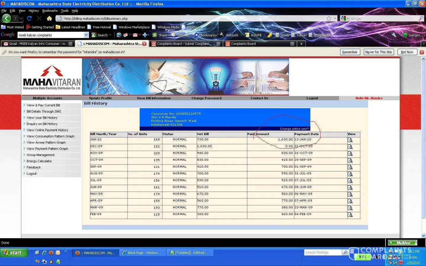 This is Mangesh Hendre, currently live out of the country. My mother lives in Kalyan (Thane, Maharashtra, India) and MSEB is the electricity provider for our area. I use my HDFC online Utility Bill payment facility to pay the electricity bills. I paid my electricity bills for months of Nov'09 and Dec'09 on Jan 13th 2010 (together for both months R...