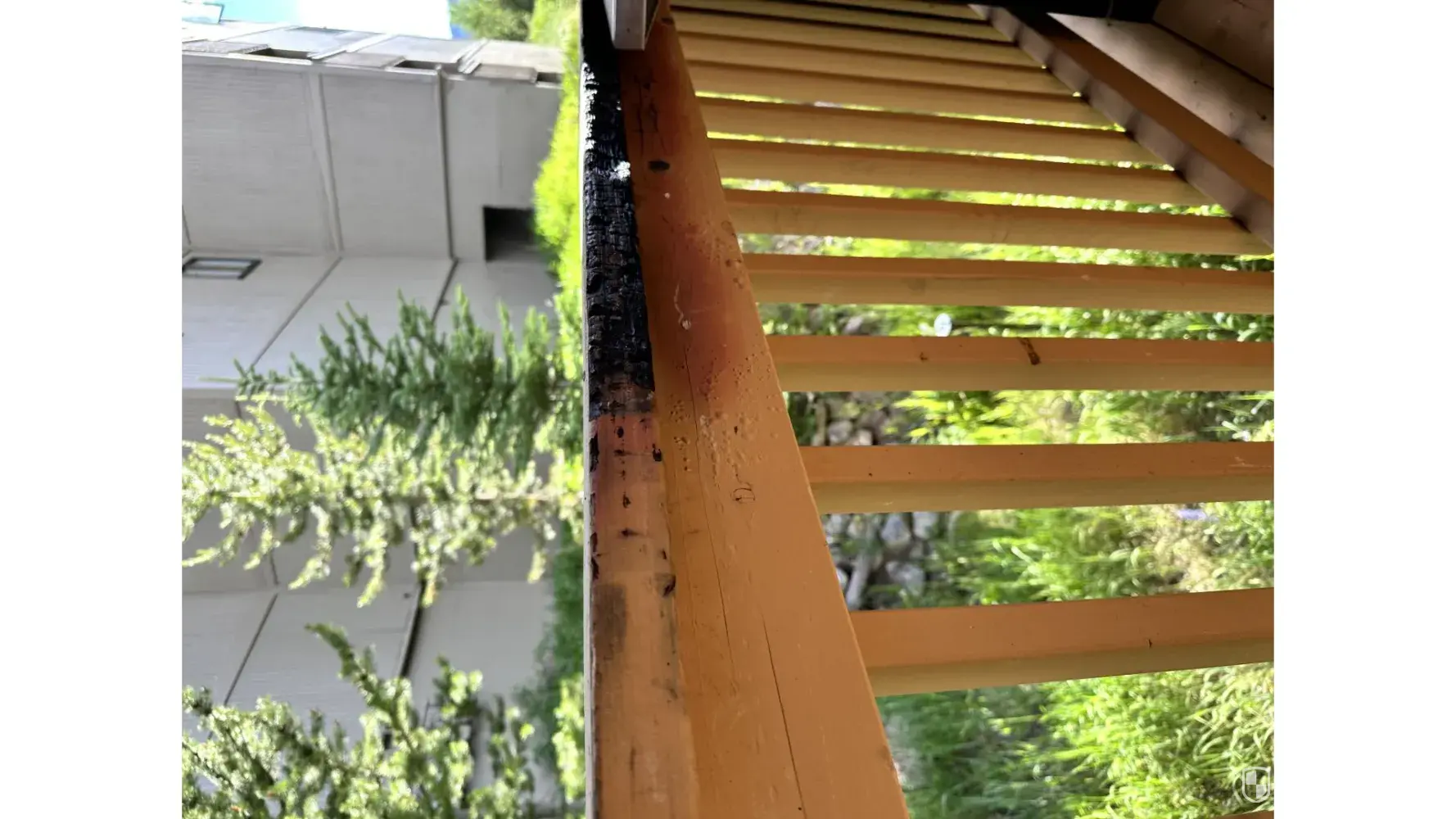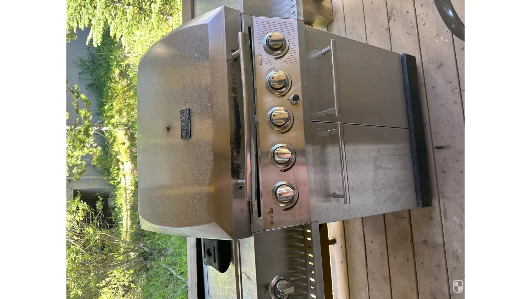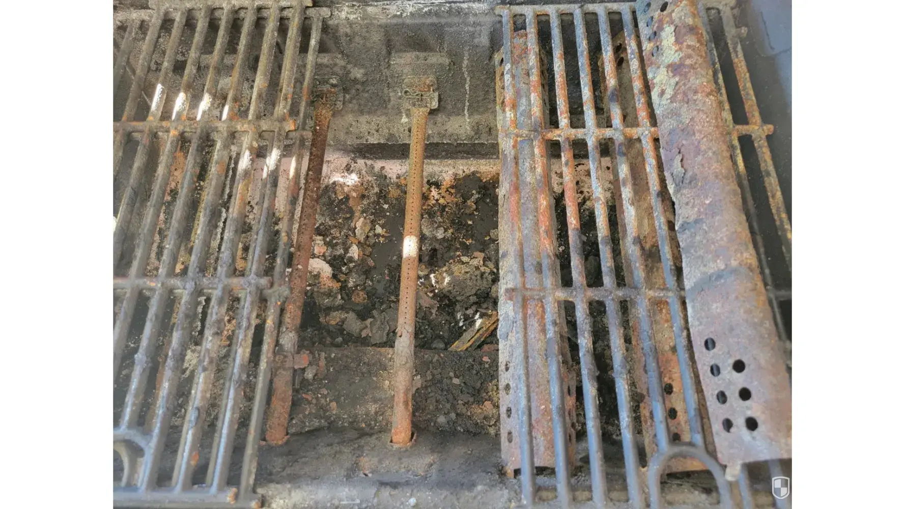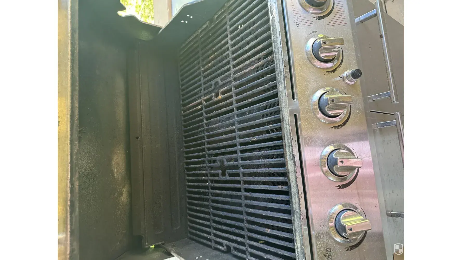 The grates on the gas grill were dirty and the wood piece behind it was burned.