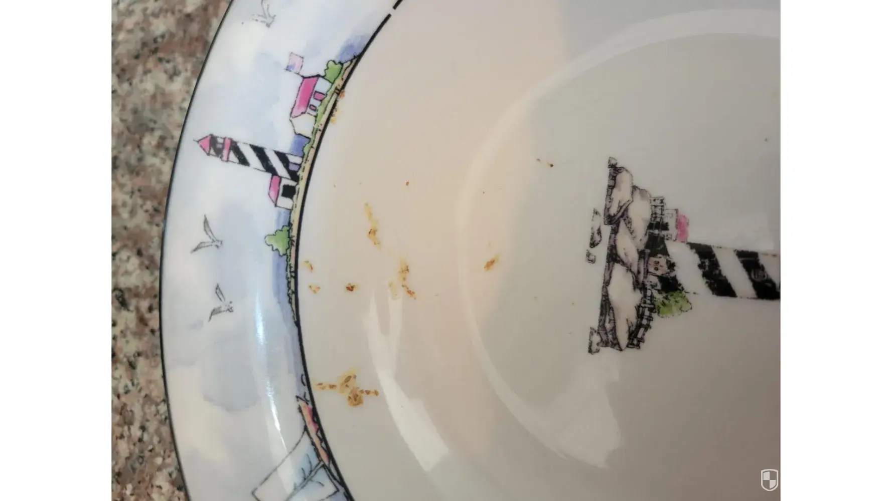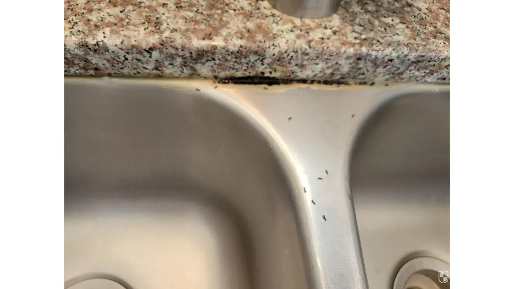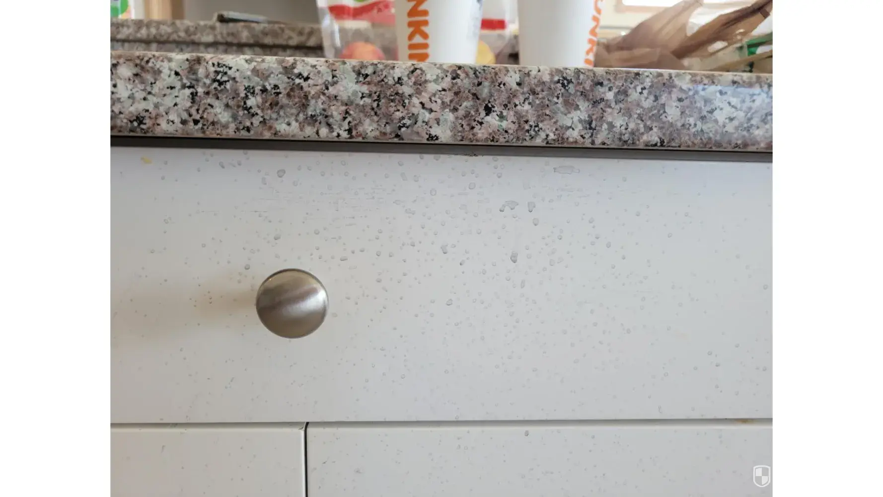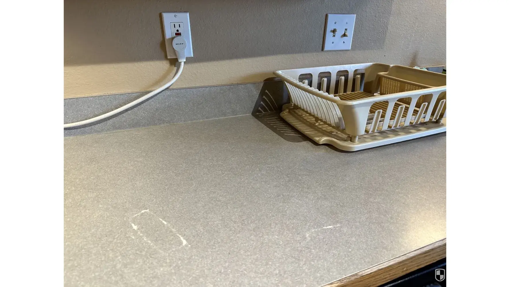 Kitchen counter has stains on it. I also love how someone watered down the hand soap (Mrs Meyers) that is on the counter.