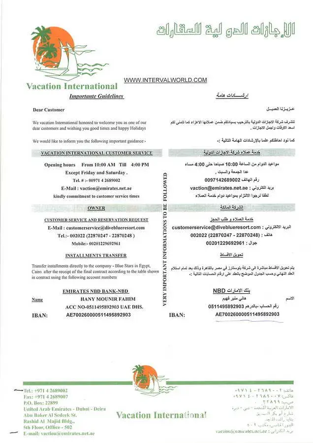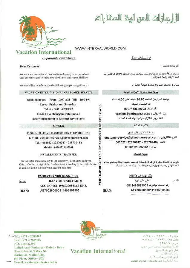 Now they have started telling, I am fake. They tell this to misguide you from knowing the truth. The attached paper was given by vacation international to me, when I signed the contract. It contains their Emirates NBD Bank account number and lot more stuffs. This information won’t be given to any other individual other than customers & business partners. What I say is true from bottom of my heart, believing or not believing it’s up to you. You can sit in line with us, if you want it...