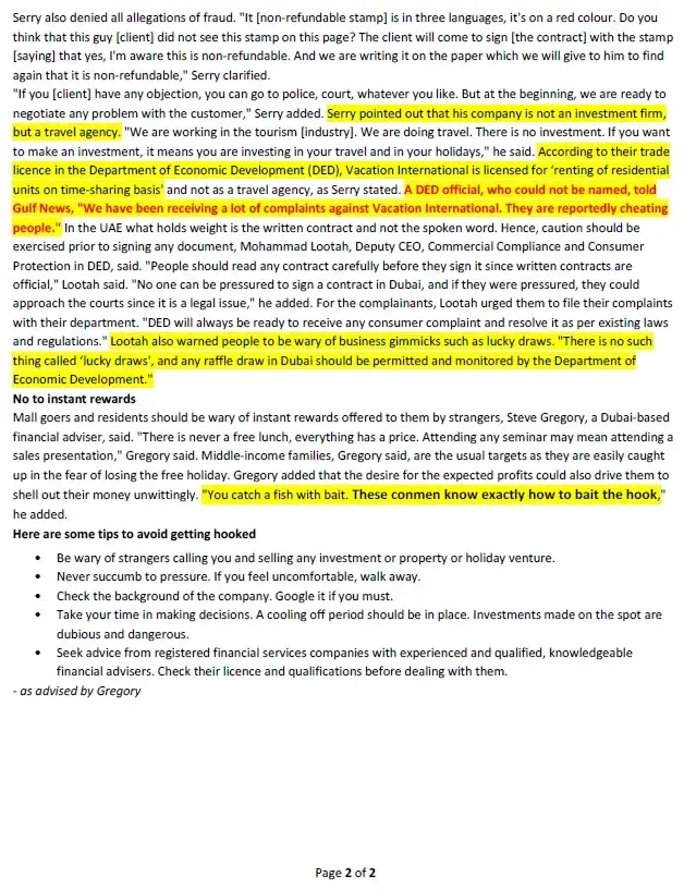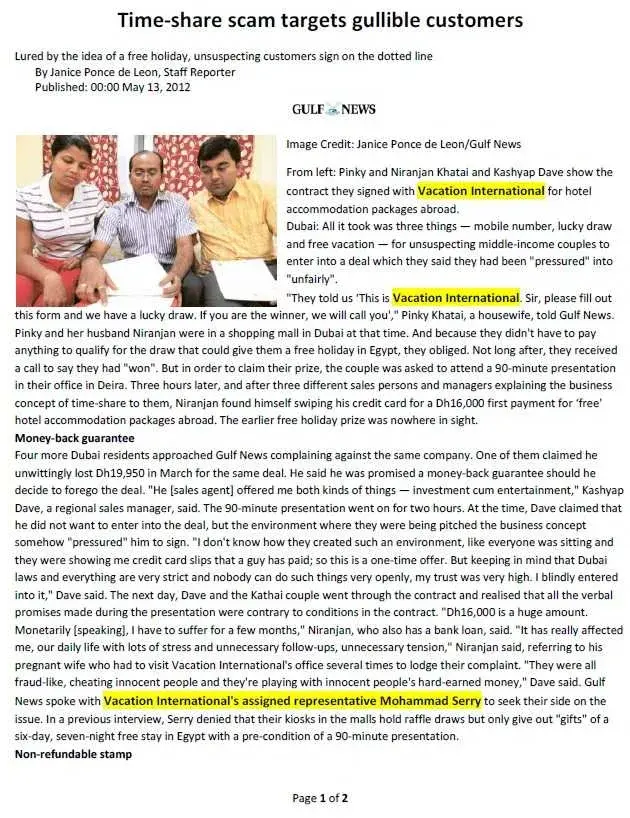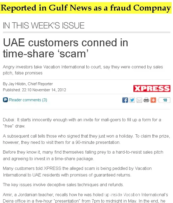 WHY A NATIONAL NEWS PAPER (GULF NEWS) SAYS VACATION INTERNATIONAL IS CHEATING? (Picture Attached)