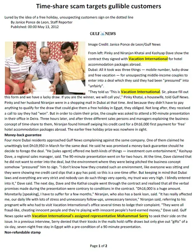 Please refer attached 2 image files, Gulf News Article about "Vacation International - Cheating"