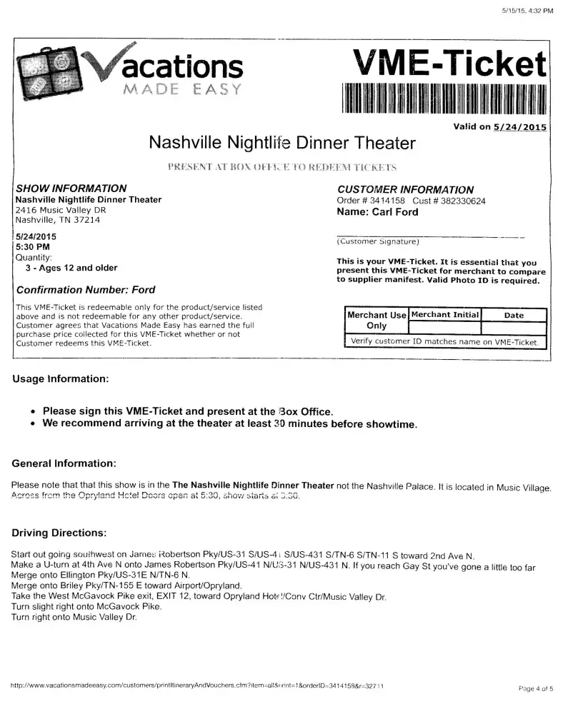 Finally, I called myself to let them know we were going to drive ourselves to the event. I was put on hold. When the operator returned, she asked me to read information from my ticket. She put me on hold again. This time she came back with the message that there must be a mistake. I didn’t have reservations for three at the Dinner Theater, would I like to go some place else? When I protested with, “but my ticket says, ” she said, “I’m sorry, there is nothing I can do. Contact VME.”