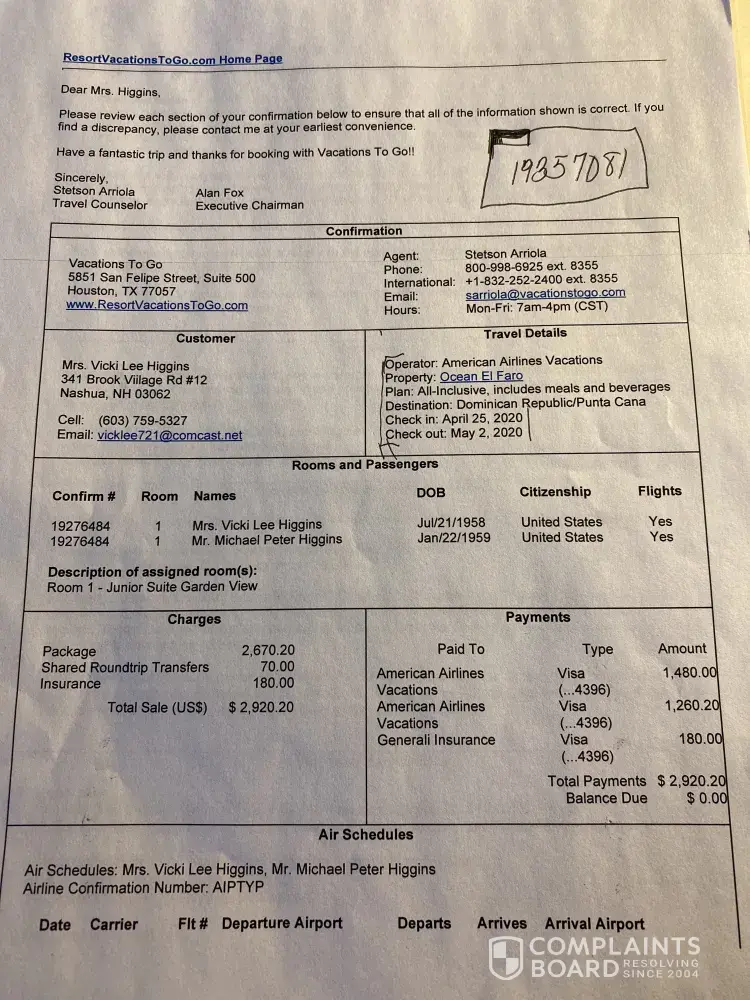 In conclusion, I strongly advise against booking with Vacations To Go. They don't care about their customers, and they will take advantage of you if they can. Save yourself the trouble and book with a different company.