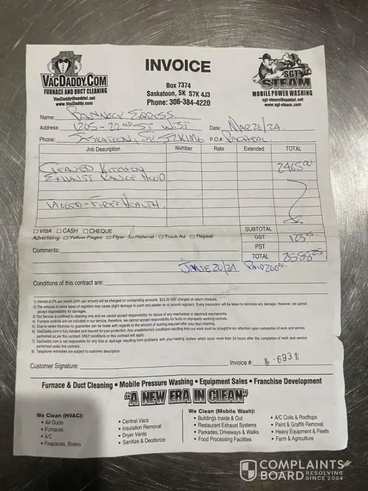 Lady asked for her ducts clean and you procceded to do a whole bunch of extra work without asking here and the procceded to charge her 2600$ and then call her resturant threatening her with legal action if she refuses to pay her outrageous invoice 250$ an hour for labor mechanics dont even make that con artist scum of the earth charging gst with no buisness number or cra tax number you have been reported to the cra for tax fraud multiple times also when you fill out an invoice you have to have all the work that was done on the invoice, man hours etc. I'm sure they know this and are just trying to rip off people