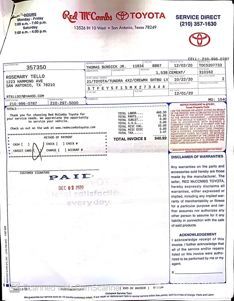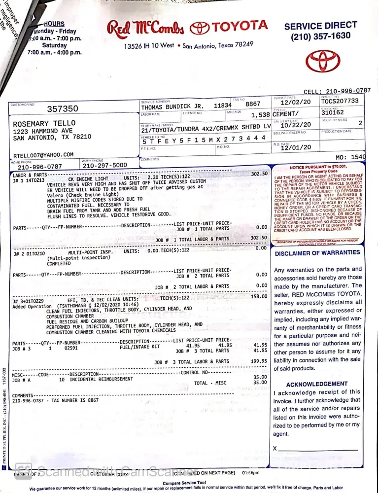 Filled up a full tank of regular grade gasoline on Sunday 11/22 at the Circle K location #27421 at 841 Bitters Rd. San Antonio, TX. Used card number ending in 2818 for charge of $34.63. For the rest of the week while starting my engine, it would sputter and rev unprovoked. It seemed unusual but I ignored it until 12/1 when the truck completely shut off...
