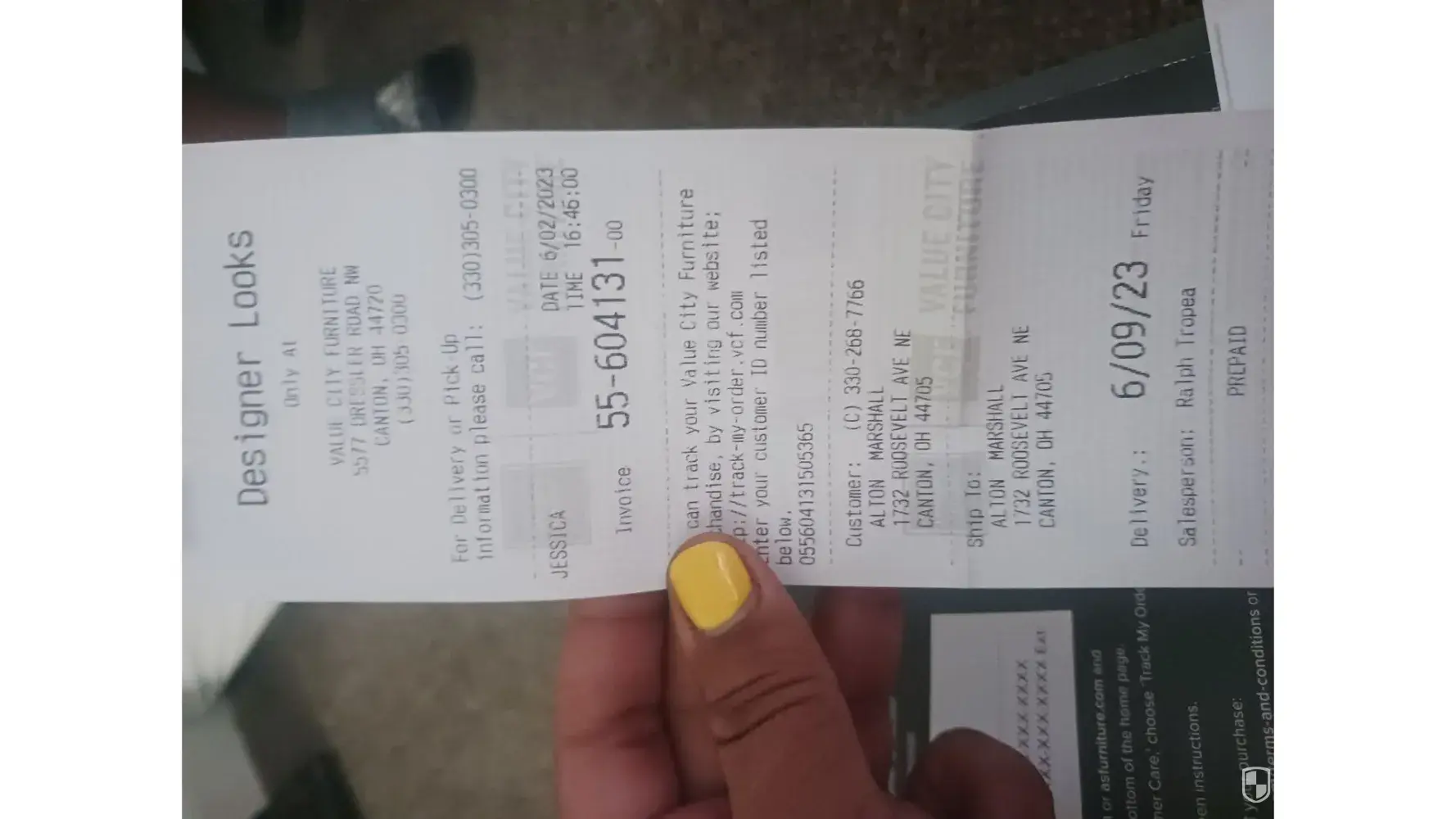 I "purchased" not "financed" a living room set & buffet server ($2,414.12) from your company on 6/6/23. I received email/text confirmation from VCF Waldorf with my order information. Then I received a phone call confirmation with an initial delivery date of 6/16/23 then was left a voicemail stating that they couldn't deliver until 6/27/23. My son took time off work to accept the delivery on my behalf so that I could go to work today. When they arrived today around 1:15 p.m. they informed my son that they only had the base of my table and the server. My son immediately called me, and I told him to advise the driver to wait until I spoke to someone in the VCF Waldorf store to find out what happened to the rest of my order. I called the store, explained the situation, and was told that the computer system has an issue at this time and unfortunately, it's affecting the customer's orders. She said she would take my number and have the warehouse manager call me back. I missed the call due to being in a meeting when the warehouse manager, Quam, called me back at 1:40pm. He left a message to let me know that a table top they at the store was damaged beyond repair so they can't deliver that one today so a new one must be ordered, and my remaining items can be delivered on Friday June 30th.