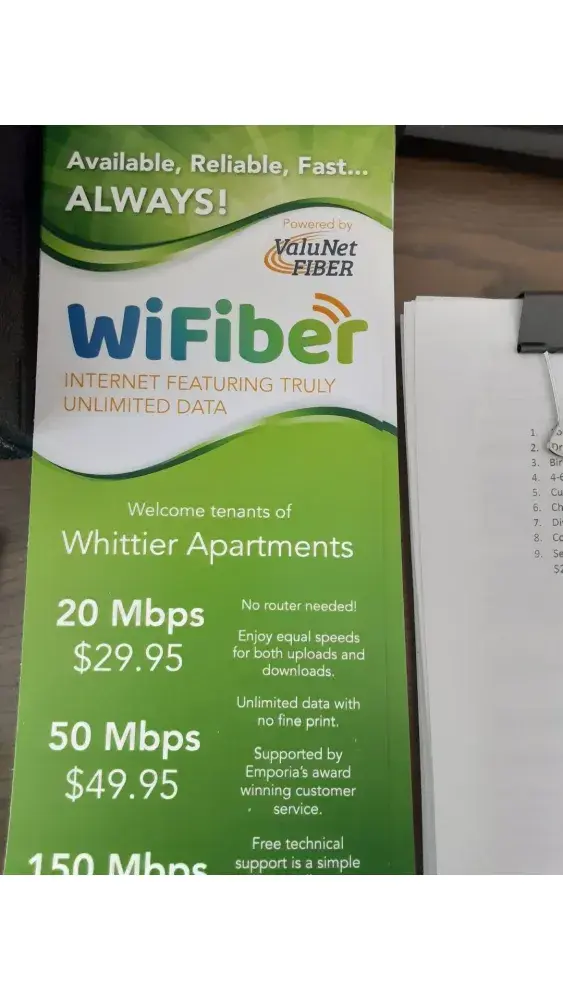 No wifi berry in New building. They have flyer out advertising wifiber. These apartments are low income. They should have wifi berry there too. After all they are advertising wifiber at Whittier place. February 25,2022 time 9 am. The flyers are in the office. We should get the same service at both buildings. Even the manager was surprised wifiber was not in the other building. They should of been informed to let residents know what going on.