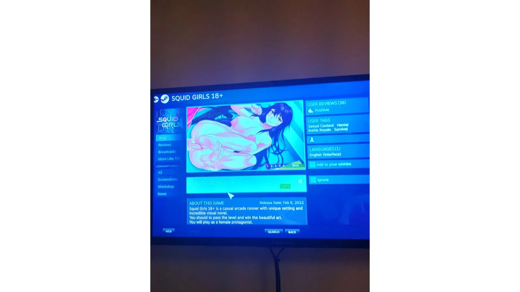 While browsing the store in big picture mode, I came across a game called "squid girls". Assuming it to be a game about the actual tv show "squid games", I opened it in front of my little sister. It was PURE PORNOGRAPHY. While I'm not against games like these existing, I would want an option to prevent these titles from showing up. This happened February 7, at about 7:25 in the evening.