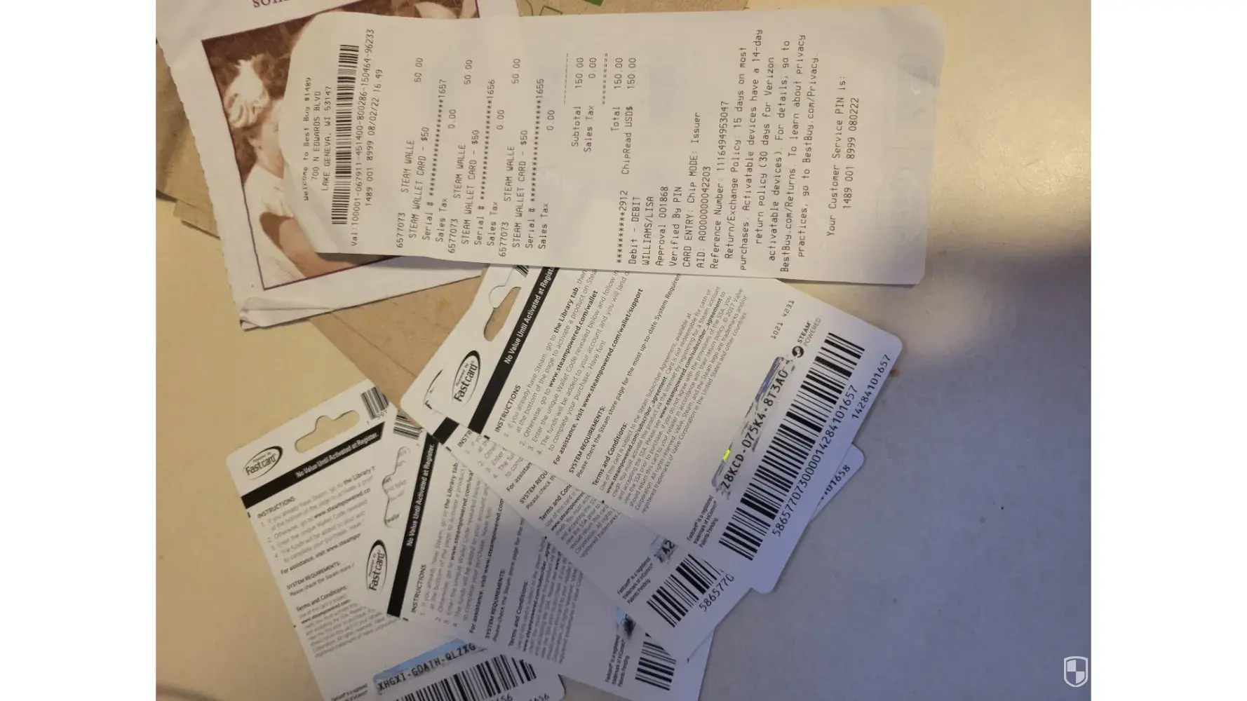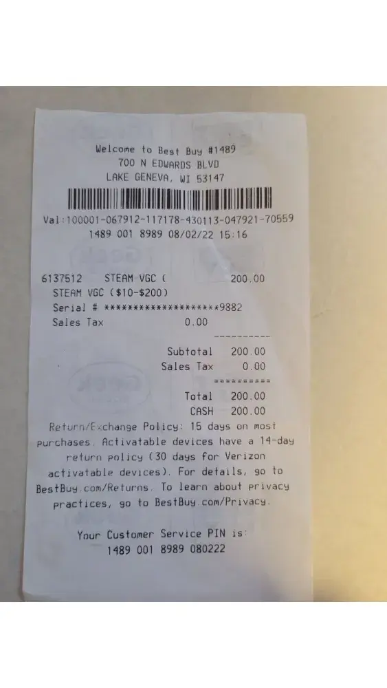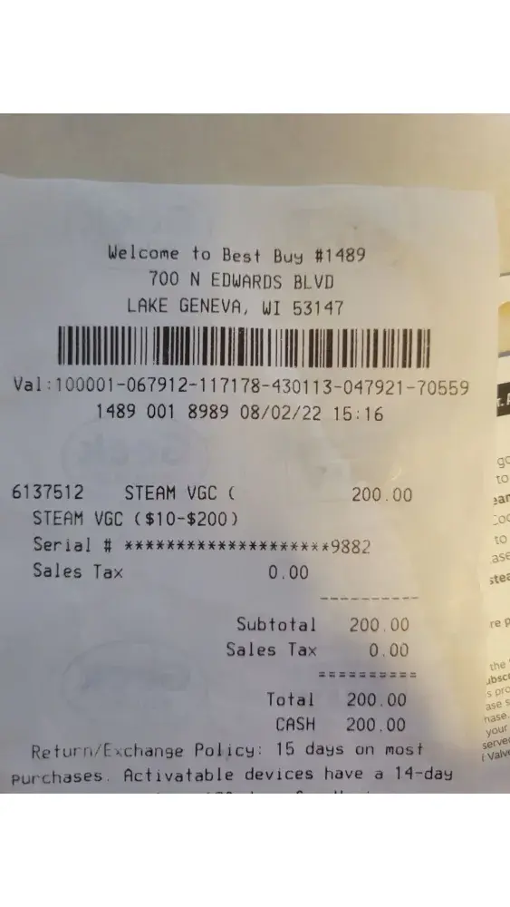 On 08/02/2022, I purchased a Steam wallet card for $200 from Best Buy in Lake Geneva, Wi. Store #1489. I took a picture and sent it to my boyfriend in the military overseas as a present. When he tried uploading it, it said the code had already been redeemed. He told me to go back to the store. The card has been used. He took a picture and sent it back to me. I went back to the store, showed them it was already redeemed and the store said they couldn't do anything, so I had to purchase another $200. This time I did four $50 cards. We uploaded one at a time at the store to make sure. I called Steam [protected]. I left a message. No call back. How do I get my $200 back? Absolutely no customer service. When I tried the website, I have to have a Steam account, which I don't have. My boyfriend is currently serving in US military in Syria. I'm stuck in the middle here. I want to know how a new card has a used code.