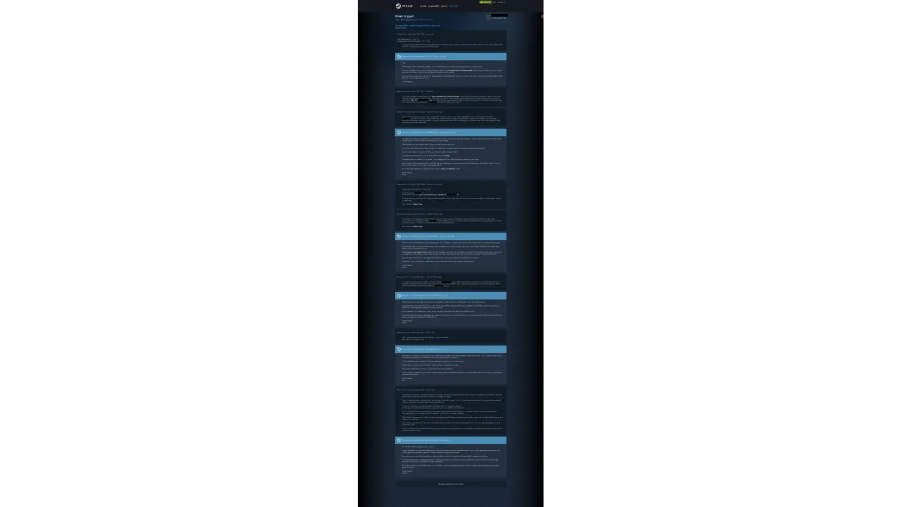 I proceeded to open another ticket to get another Steam Customer Support employee to actually look at the ticket and give a proper response, but they all ignored the content of the ticket and mindlessly copied random F.A. Q. responses that were entirely unrelated to the content of the ticket.