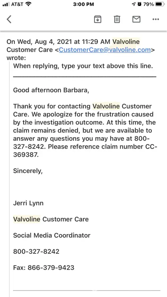 VALVOLINE CUSTOMER CARE- AN AUTOMATIC EMAIL FOLLOW UP REPONSE/ REPLY THIER WAY TO OF DIRECTING COMPLAINTS INTO A TRASH BIN ON THE COOPRATE COMPUTER.