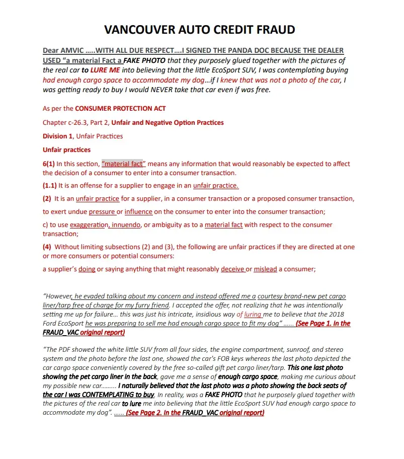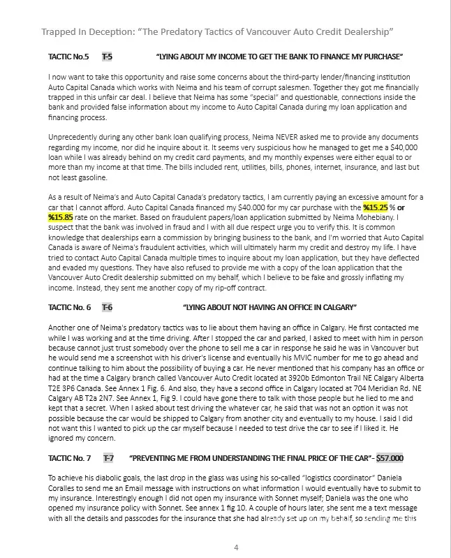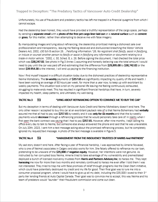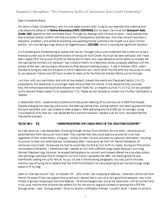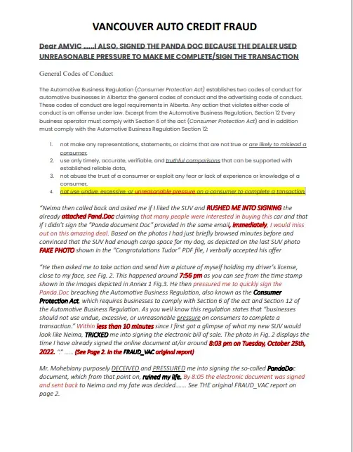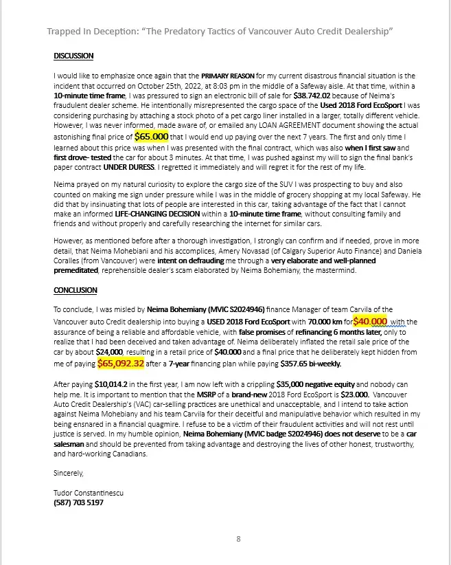 To Whom It May Concern, It is with deep concern that I bring to your attention the unethical and unprofessional behavior of Neima Bohemiany (MVIC S2024946) and his team, Carvilla at the Vancouver Auto Credit (VAC) dealership that committed fraud. Through my dealings with him and his team, I have realized that their practices directly conflict with the...