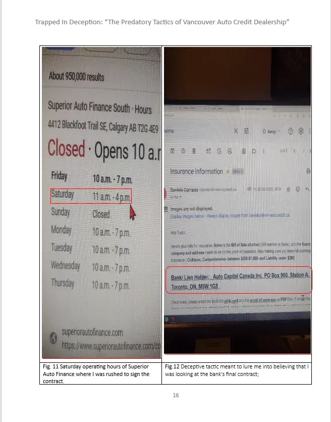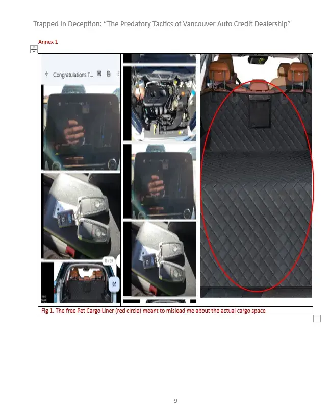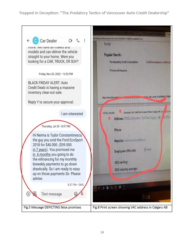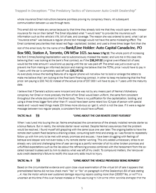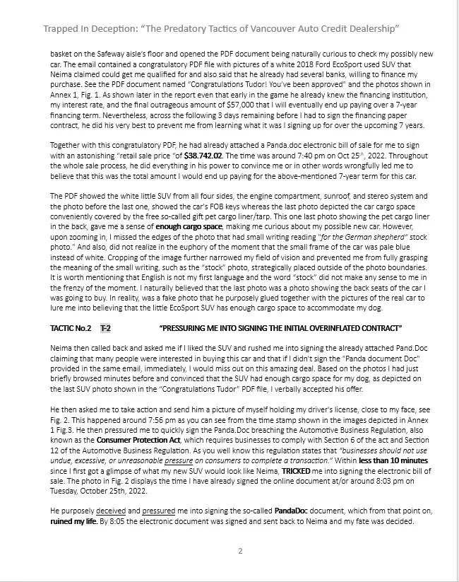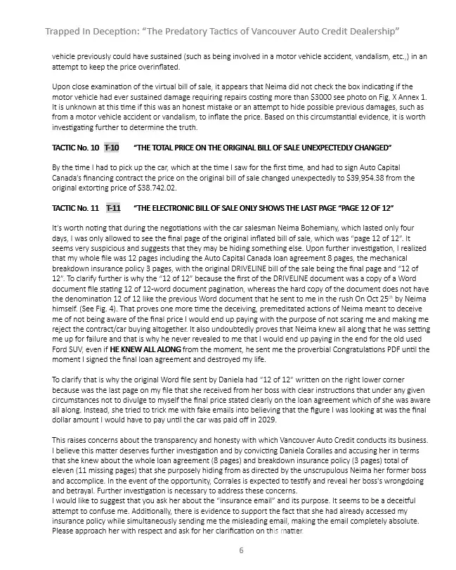 To Whom It May Concern, It is with deep concern that I bring to your attention the unethical and unprofessional behavior of Neima Bohemiany (MVIC S2024946) and his team, Carvilla at the Vancouver Auto Credit (VAC) dealership that committed fraud. Through my dealings with him and his team, I have realized that their practices directly conflict with the...