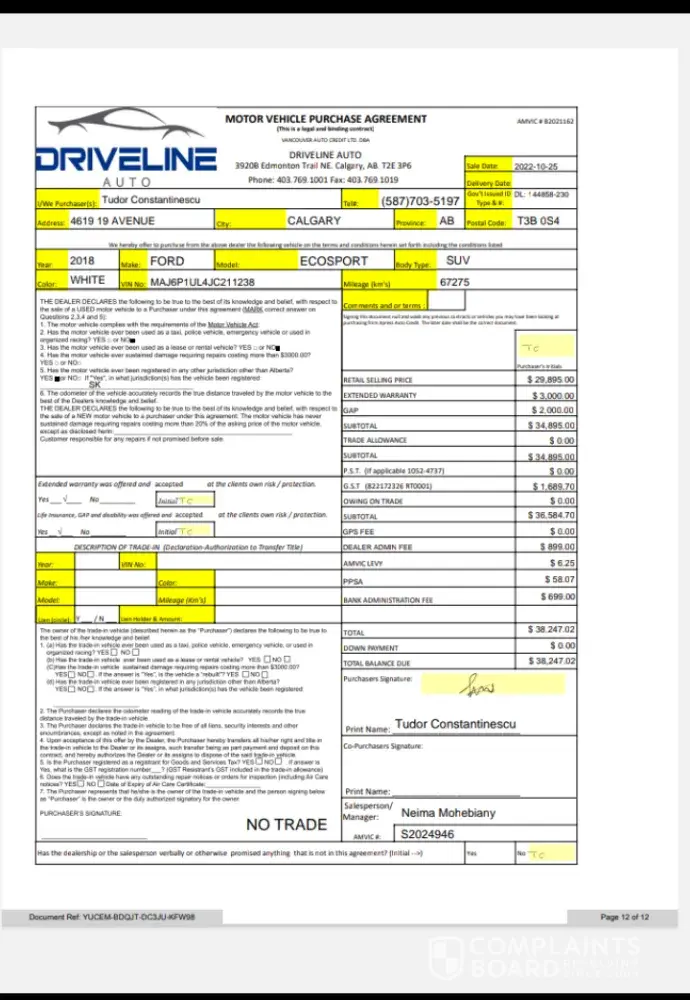 2018 EcoSport faulty engine repair denied warranty claim that I did not make. Drayton Valley Ford made the claim.
