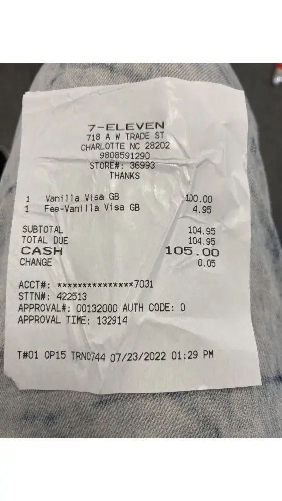 This vanilla Visa card was duly paid for with cash at a 7-Eleven Store, with address 718 AW Trade St, Charlotte NC 28202.