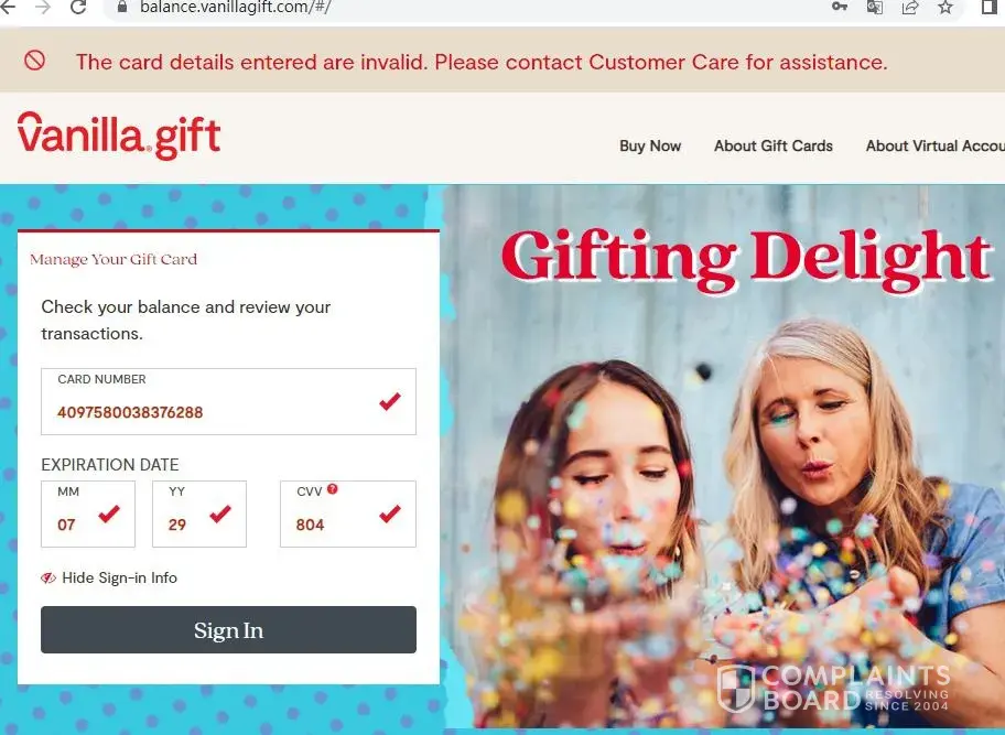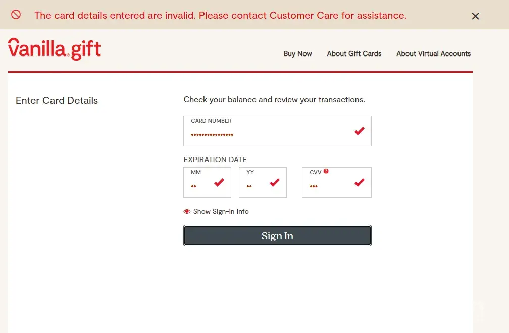 On getting to the website to confirm balance, i filled the necessary stuffs and it was checked to be correct only to check balance and got 'Invalid Card' message. Tried 3 more times and reached out to sender to call Vanilla and they also claimed it's invalid, but how so, they don't know. Please find attached the message I received, the debit card and also the reciept of purchase.