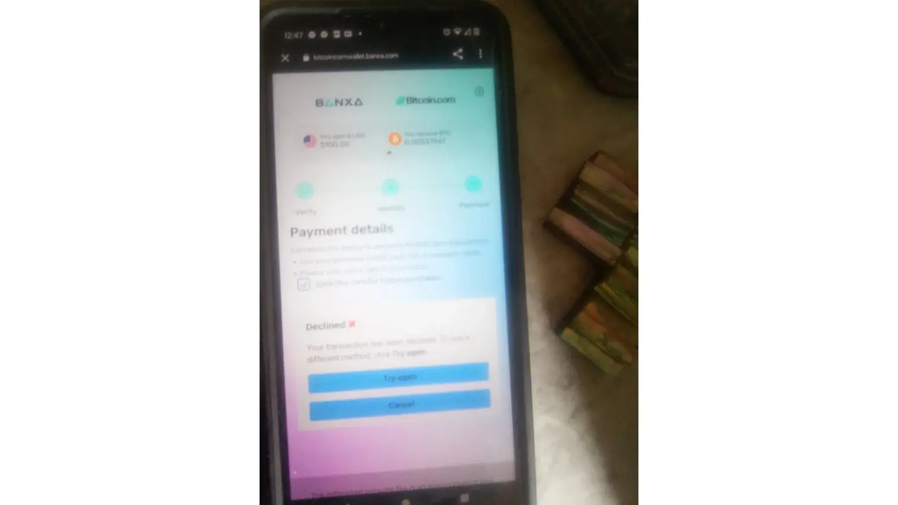 I try to check my bal online ,an I called an still would not give me my bal ,I wanted to buy bitcoin.com 100.i need it to pay a bill.an not noing my bal ,make it pretty hard I call you people an you said that the cards unlock just make i used my cvc # I did that an you still declined my payment I want this payed do to bitcoincomwallet.bbanaxa.com .I need this payed today do you under stand please pay this or I loose my account.