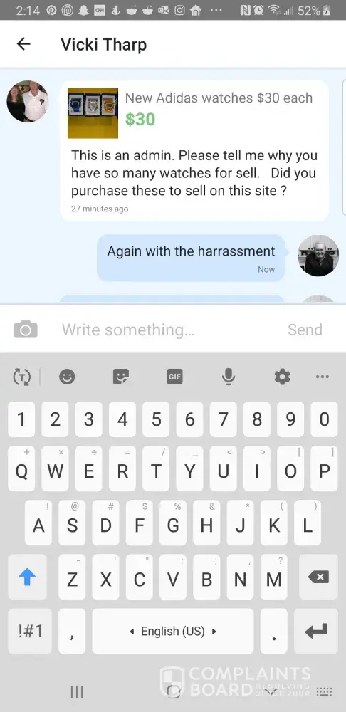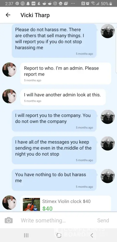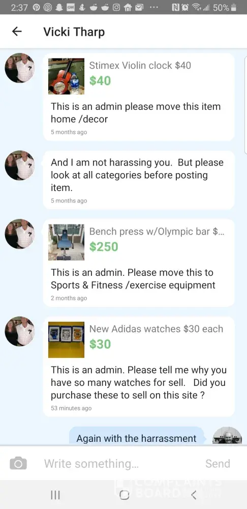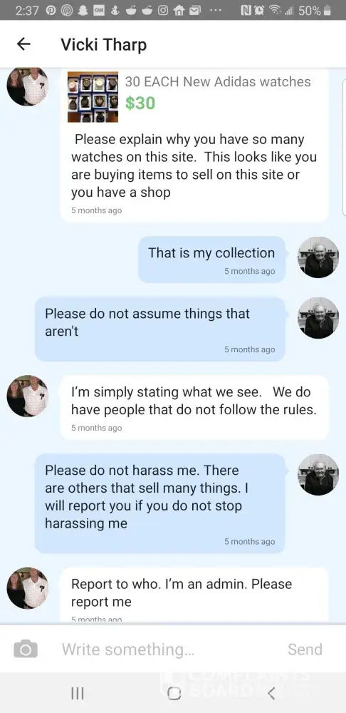 Lake Jackson to be exact and I sell many things and lately I have been getting harassed by this admin named Vicki Tharp. She is from Angleton. She is constantly asking me why I have so many watches for sale and frankly they are my personal collection and she does not stop harassing me. It is not the first time that she sends me messages in the middle of the night like today for instance at 2am and begins asking me the same thing in regards to my watches. My phone wakes me up as a result of her messages to me. She always does this in the middle of the night. She has nothing else to do but harass me. I would like for her to be removed from admin and I would like for her to stop. She wakes me up with pointless messages and begins with her constant harassment about why I am selling this or that. This site does not have restrictions on how many watches I can sell and it isn't her business as to my personal watch collection. There are many people here selling similar items such as baseball cards and what not and I believe she is deliberately targeting me. Please remove her at once.