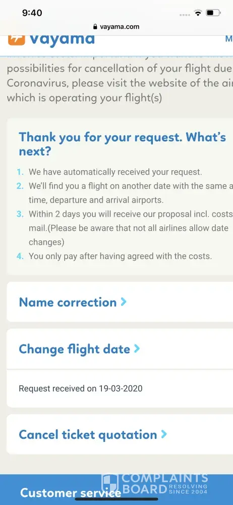 While airlines are offering voucher or free of charge dates change, Vayama is ignoring customers requests and not making a date change a free option. Not possible to resolve via airline directly as Vayama is used as travel agent. No clear instructions on their website to follow. In light of COVID which received Disaster Designation in the US. Not possible to reach them via call or email provided for customer services. No real time updates email on what to do for customers with upcoming travel scheduled.
