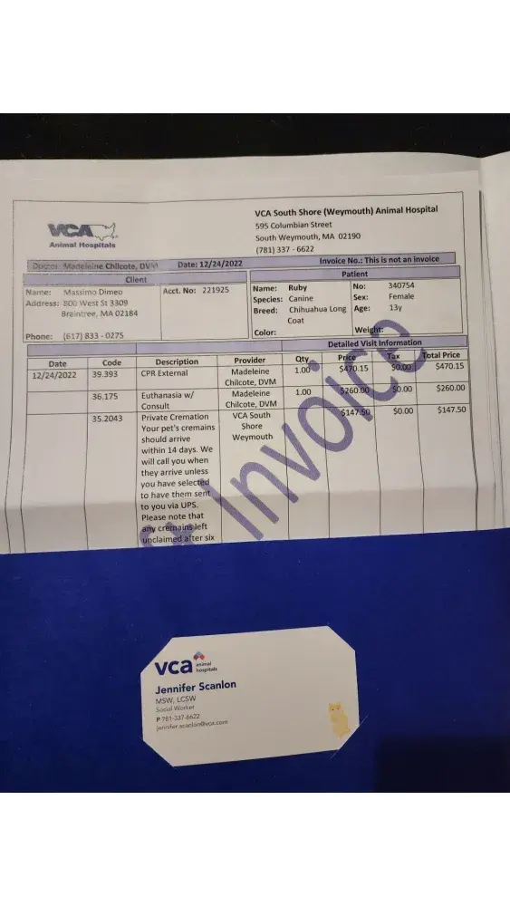 We will never be returning to VCA Southwick animal hospital and have transferred our pets to a more reputable veterinary hospital with better reviews, services and customer service.