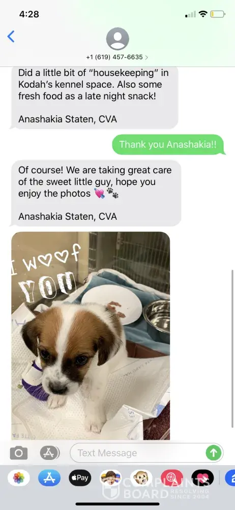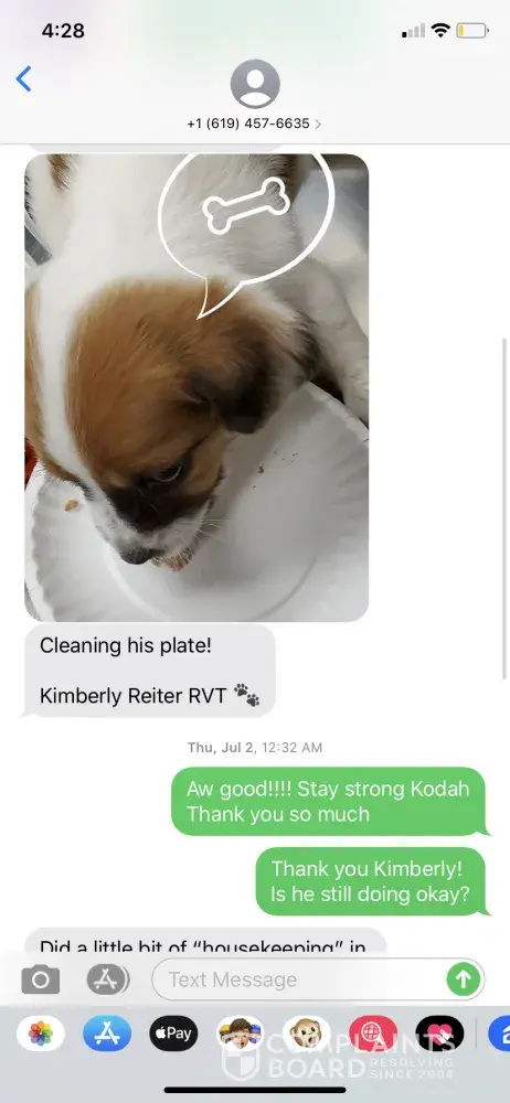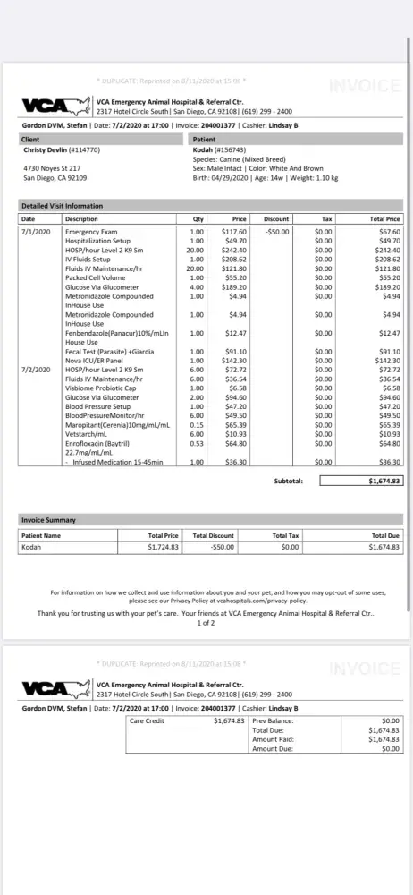 Our puppy, Kodah, at 10 weeks old, was rushed to our personal vet for extreme diarrhea & no appetite for 24 hours, and then transferred to VCA Hospital on Hotel Circle in San Diego. He was dehydrated, a bit anemic & his blood work wasn't looking good - but not deadly. After staying overnight one night, Dr. Lan said he should be coming home that morning...