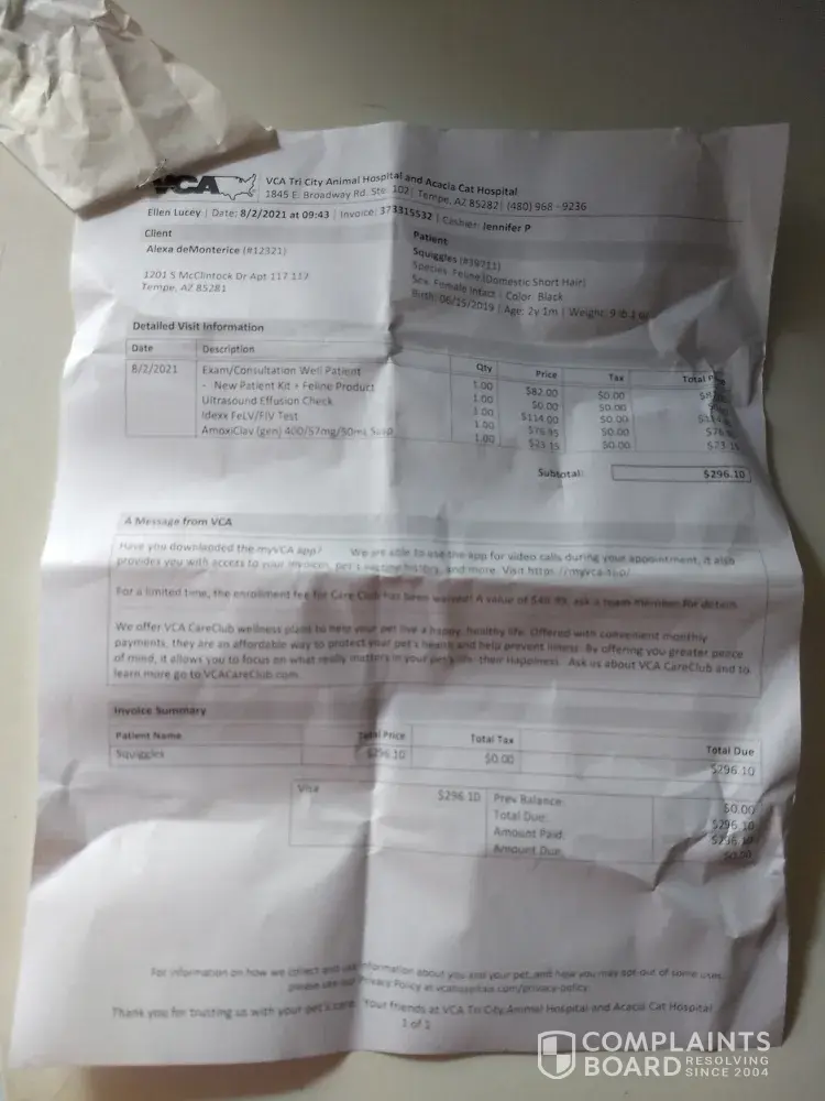 This is specifically about the VCA Animal Hospital in Tempe, AZ on Broadway Road. They did not provide proper follow-up care when my cat's infection resisted treatment. After I called 3 times, a technician finally called me back and was unable to answer any of my questions! She basically blew off my concerns. The vet had told me this was a serious infection and the tech acted like it was no big deal. I spent $295 for the vet appt and they can't be bothered with proper follow-up? I've been a customer for 8 years! I was told spaying my cat would fix the problem They wanted to charge me $850 to spay vs $350 elsewhere!