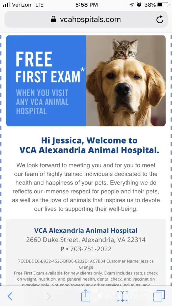 I called ahead when I saw that the first visit was free. Kayla was rude to me at intake. Upon payment of my pet's medication, I was charged $186.91 and I was told by Kiana that I needed to bring a printed coupon. Nothing about a printed coupon was communicated to me when I called beforehand. The customer service here was poor. I have a digital coupon, which I can validate.