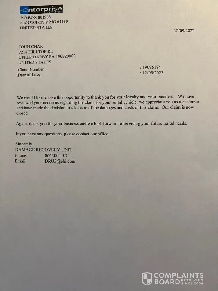 11/23/2022: Rented car from Enterprise Rent-a-Car, 811 Main Street, Darby, PA 19023 12/05/2022: Crack was discovered in windshield of rented car. Called Enterprise to report it. 12/09/2022: Received letter from Enterprise Damage Recovery Unit (attached) stating that Enterprise would cover the damaged windshield and we would not be responsible for...