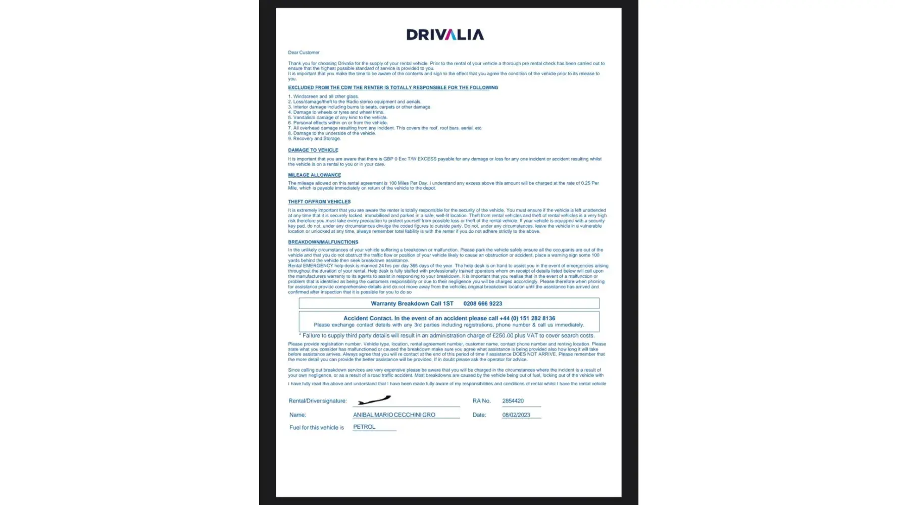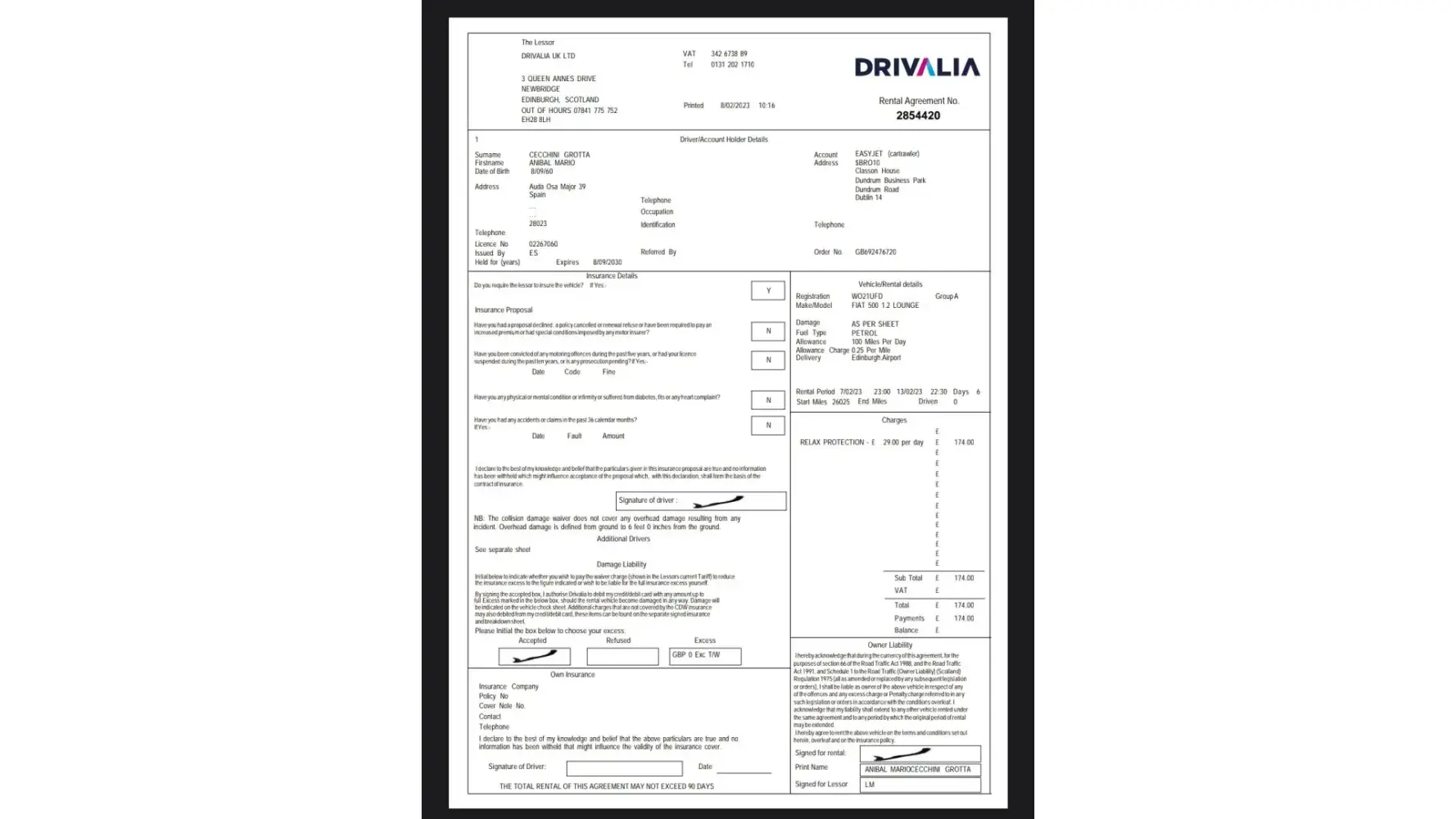 I schedule a car reservation at easyjet car rental on February 6, 2023 with the number GB692476720 to rent a fiat 500 from February 7 11 p.m. to February 13 11 p.m. at Edinburgh airport, I sign an agreement with CarTrawler for 122,96€ in which I decide the level of risk that I want to assume by paying the corresponding rate of 122,96€ with Mastercard...