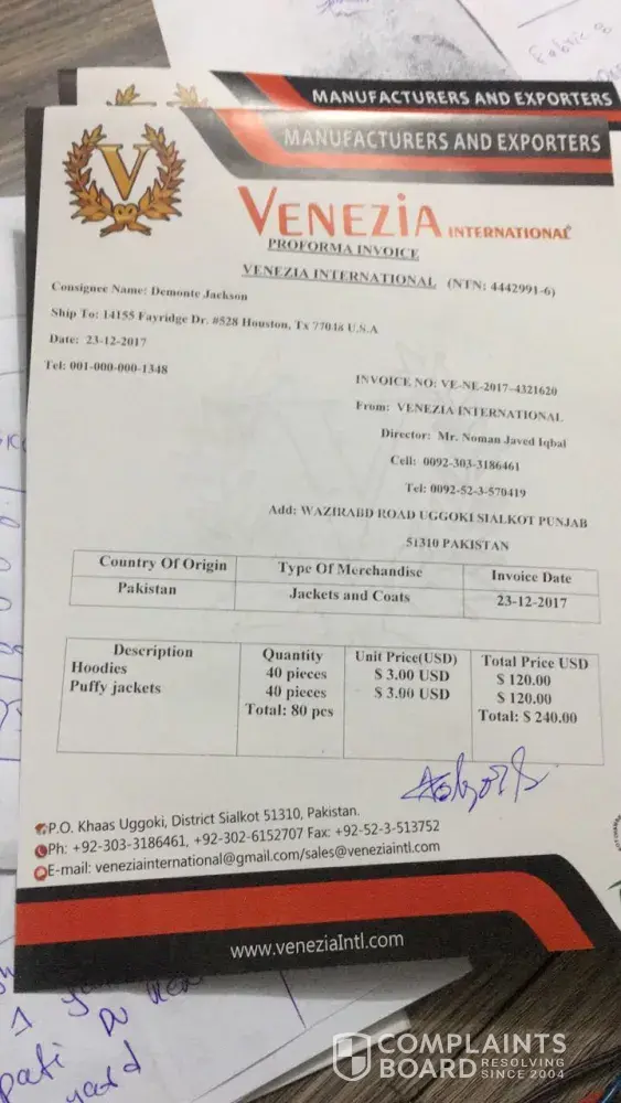 I paid $2, 000 almost a year ago for 40 hoodies and 40 puffer jackets, I still haven't received anything from them . I tried contacting them but they've blocked my number . I have payment confirmation and documents . This company is ran by Noman Javed Iqbal they are BIG scammers . DO NOT do business with them . I contacted them through Alibaba so do not deal with Venezia International . They threading me for making complaints in the past . Will Post pictures of Mr. Noman