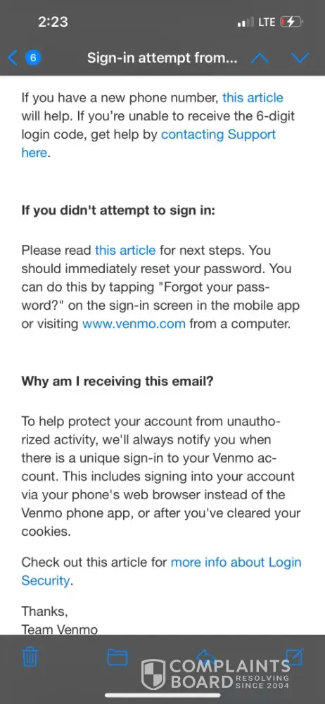 By way of a brief background, at 6:48 Friday, she got an email (no text, no call) saying someone was trying to get into her account from an unregistered device. She was not on her email or her phone because she was at work so she did not see this. Within ONE minute (email also time stamped at 6:48), she received another email saying that an instant transfer from her account was completed...to a totally new bank account that the hacker had JUST added. NO FLAGS on Venmo's part. NO temporary freezing of her account to verify the authenticity of the transaction. NOTHING.