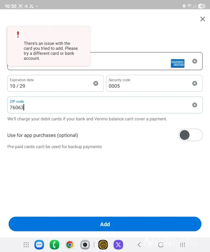 Most unuser friendly app. No detail as to why you can't add a credit card to the app. When you do finally get the card added and you attempt to use that payment method, right off the bat, "this is a scam we stopped it". No explanation and the lack of customer service aren't enabled to service the customer to resolve the issue. PayPal ruined this platform. Thank God for other services. This one sucks.