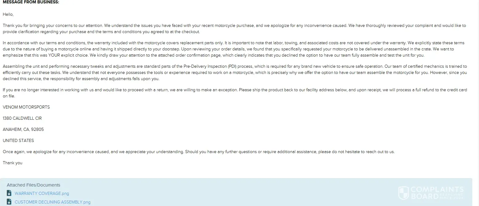 DO NOT DO BUSINESS WITH THIS COMPANY...PLEASE! The worst experience of my 40 years on this planet. I paid in full for a LEMON motorcycle that was problems from the get go. Lets start from the beginning. After receiving my motorcycle, I was able to ride it for only 250 miles before it quit and died. The motorcycle was the definition of a LEMON. They tried to down play and say it was a bad carberuater, so they sent me a new one. After replacing it, I experienced the same problem. Eventually, through all the poor customer service I had to deal with, fighting tooth and nail, they finally said they would refund my money. I am still out about $600 due to all the money that came with trying to repair it. May this horrific experience never happen to another person. I am so happy I do not have to deal with Venom Motorsports anymore. Good riddance!